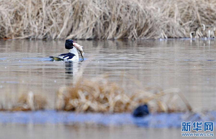中華秋沙鴨在拉魯濕地的水面上捕魚(3月7日攝)。新華社記者 張汝鋒 攝
