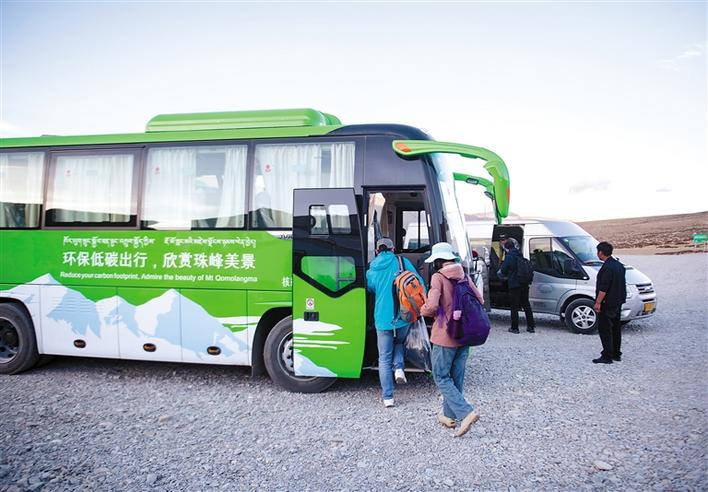 游客在珠穆朗瑪峰景區(qū)停車場轉(zhuǎn)乘環(huán)??蛙嚕?019年5月16日攝)。珠穆朗瑪峰景區(qū)內(nèi)自2019年5月開始試運(yùn)營清潔能源環(huán)保客車,以進(jìn)一步平衡珠峰地區(qū)旅游發(fā)展與環(huán)境保護(hù)需要。新華社記者 孫非 攝