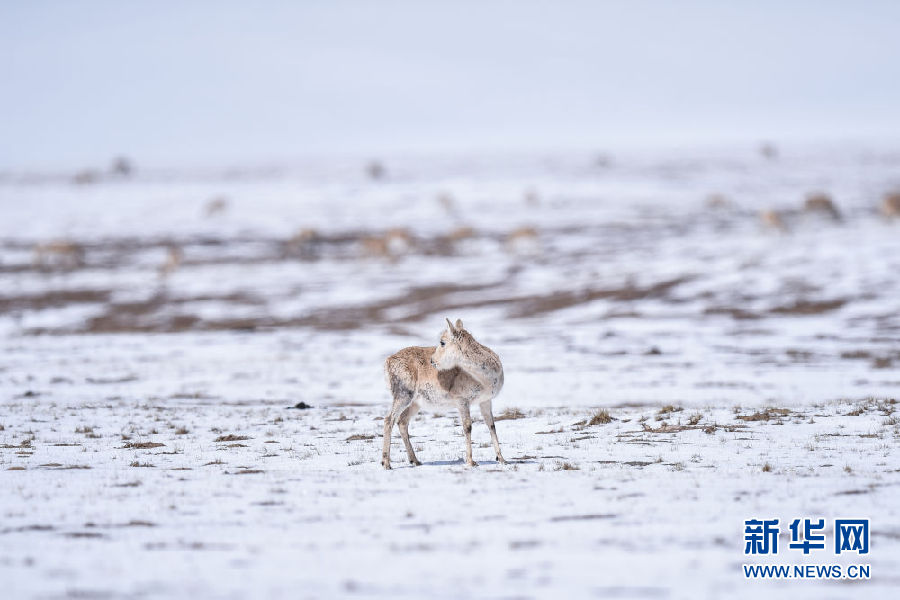 4月20日,一群藏羚羊向卓乃湖遷徙途中回望。新華社記者 吳剛 攝