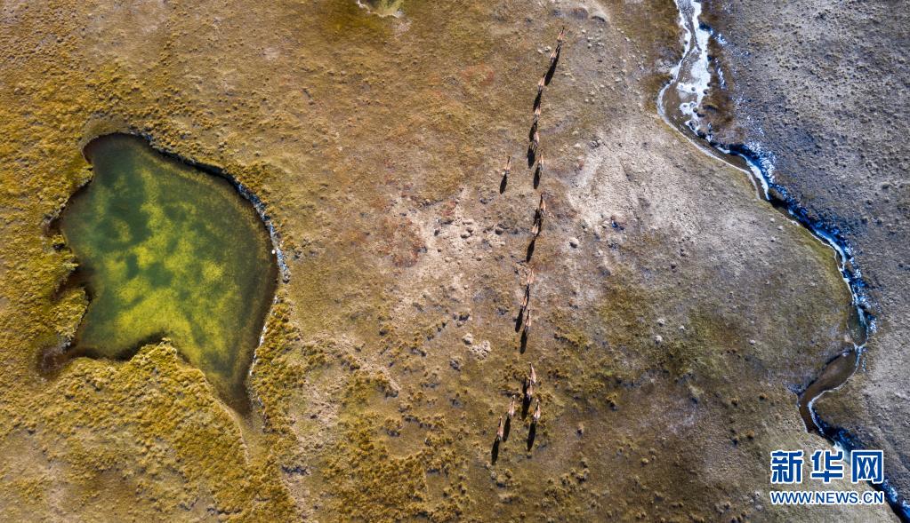 2019年10月19日,藏野驢在三江源地區(qū)活動(dòng)(無人機(jī)照片)。新華社記者 吳剛 攝