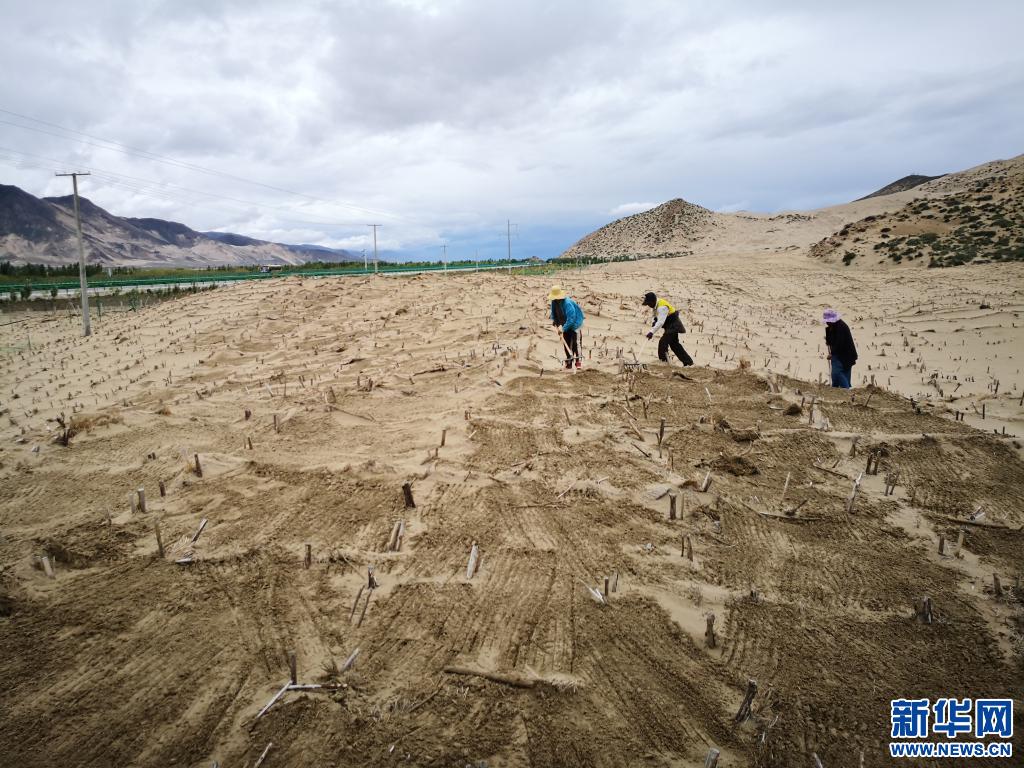 在山南市雅魯藏布江河谷地帶,村民們在維護固沙用的草方格(2019年7月14日攝)。新華社發(fā)(資料照片)