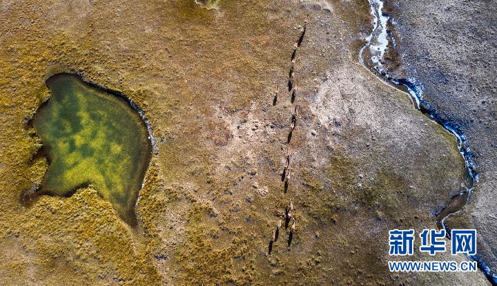 2019年10月19日,藏野驢在三江源地區(qū)活動(無人機(jī)照片) 新華社記者 吳剛 攝