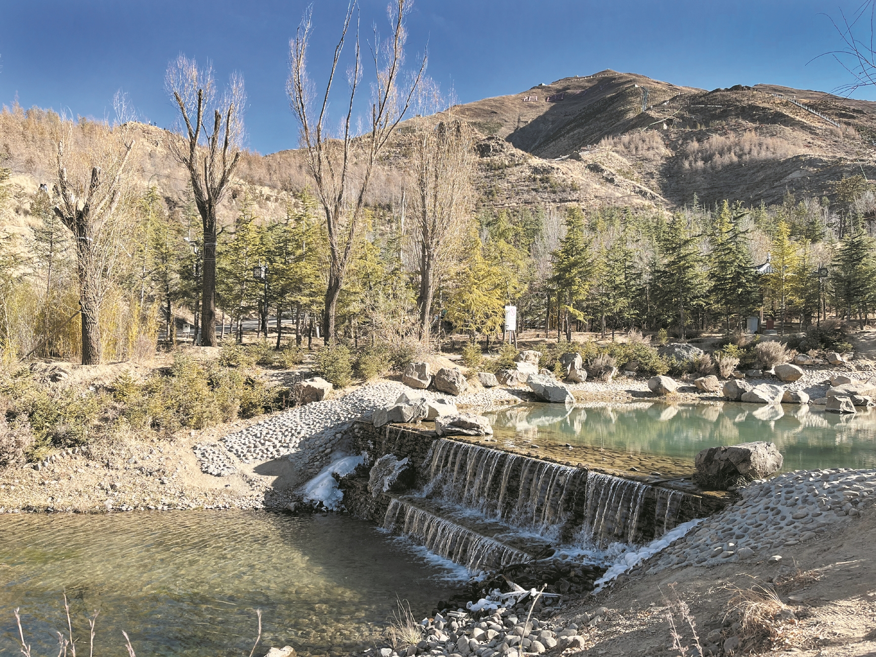除了宗角祿康公園,位于布達(dá)拉宮正南方的南山公園也是冬游拉薩的不二選擇。山上灌木叢生,橋下流水叮咚,這便是冬日里的拉薩南山公園。得益于“樹上山”工程的成功實施,如今一年四季的南山公園都是成片的松柏和叮咚的泉水,這些都使園區(qū)具有別樣的冬日美。