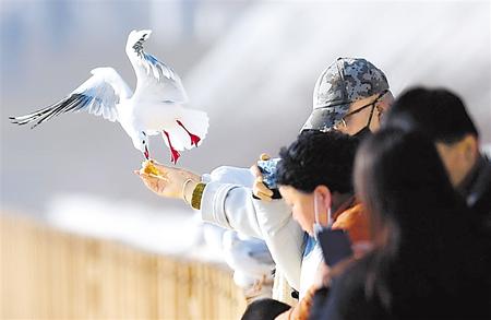 臨夏市大夏河畔,市民與紅嘴鷗親密接觸。