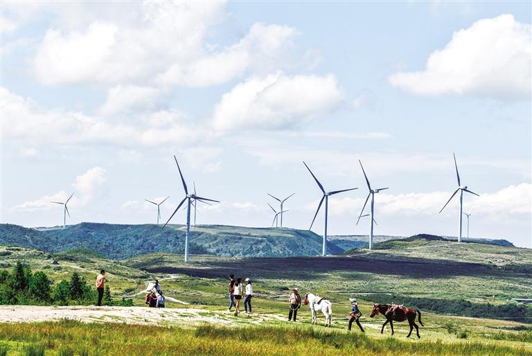 游客在貴州省龍里縣龍里大草原的風(fēng)電場(chǎng)觀光(2021年9月21日攝)。