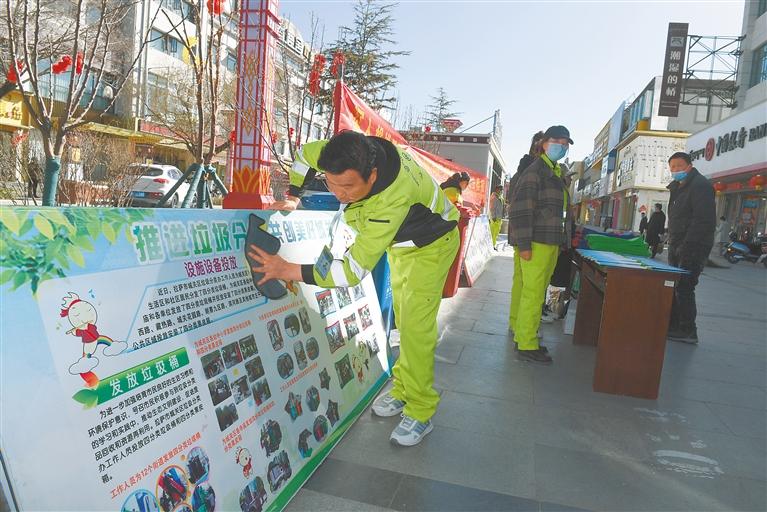 3月14日,西藏各市地紛紛開展春季愛國(guó)衛(wèi)生運(yùn)動(dòng),廣大黨員干部群眾走上街頭,參與城市環(huán)境衛(wèi)生清潔。這是拉薩市垃圾分類宣傳活動(dòng)現(xiàn)場(chǎng)。 記者 旦增蘭澤 攝
