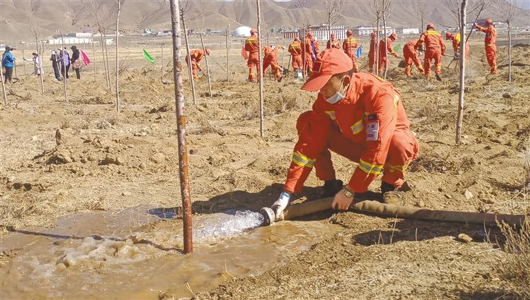 植樹造林不僅防止水土流失、調(diào)節(jié)氣候,同時(shí)也可以豐富生態(tài)資源,促進(jìn)經(jīng)濟(jì)發(fā)展等作用,是一項(xiàng)利于當(dāng)代、造福子孫的宏偉工程。春回大地萬物蘇,植樹添綠正當(dāng)時(shí)?;顒蝇F(xiàn)場消防救援人員精神飽滿、在大隊(duì)長王治平的帶領(lǐng)下所有消防救援人員鼓足了干勁,大家相互結(jié)伴,揮動著鐵鍬和鋤頭,挖坑、栽樹、覆土、澆水、齊心協(xié)力、配合默契,認(rèn)真細(xì)致地完成每一道工序,整個(gè)植樹活動現(xiàn)場到處都是忙碌的身影。“坑挖深一點(diǎn),這樣樹木才容易植活”,經(jīng)驗(yàn)豐富的二級消防士洛桑頓珠一旁耐心指導(dǎo)他的隊(duì)友?!皠幼髀槔麅狐c(diǎn),不然完不成我們班今天的任務(wù)了”,該大隊(duì)四班班長杜鵬給他的班級人員做動員?!敖衲晔俏伊x務(wù)植樹第8年。近年來,我們?nèi)湛t的綠化發(fā)展變化很大,作為土生土長的日喀則人,我們要種好每一顆樹,愛護(hù)好每一棵樹苗,為日喀則綠化增添綠?!痹摯箨?duì)分隊(duì)長嘎瑪赤烈說道。