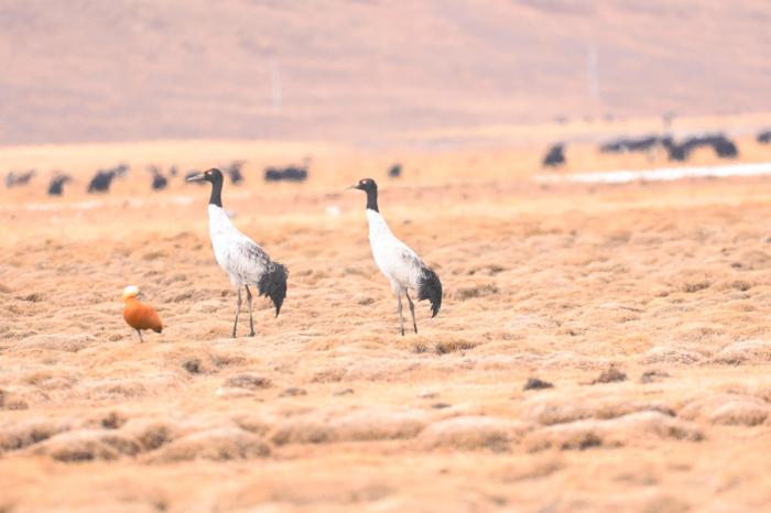 圖為黑頸鶴與灰鶴?!∏嗪6嗝郎鷳B(tài)環(huán)??萍加邢薰?供圖