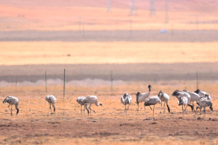 4月24日,在青海湖北岸的青海省海北藏族自治州剛察縣,攝影愛好者在該縣哈爾蓋鎮(zhèn)田間拍攝到成群黑頸鶴。黑頸鶴是全球十五種鶴類中唯一在高原繁殖和棲息的鶴類。[詳細(xì)]