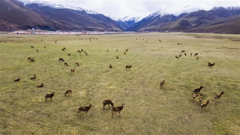 5月21日在類烏齊馬鹿國(guó)家級(jí)自然保護(hù)區(qū)拍攝的馬鹿(無人機(jī)照片)。新華社記者 周荻瀟 攝