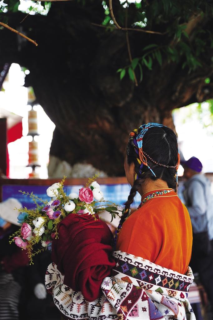 走在熙熙攘攘的八廓街,古樹已經(jīng)枝繁葉茂,陽光很難穿透密集的葉子,只能勉強(qiáng)擠出幾束光,碎落在古樹下乘涼的老人腳下。樹下拍照的游客自成一道風(fēng)景,享受著高原夏日的美好時(shí)光。
