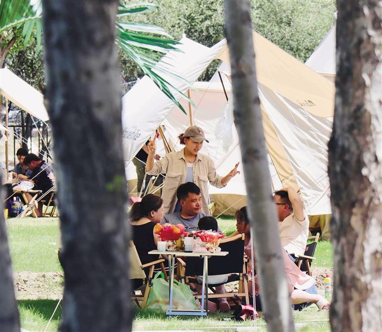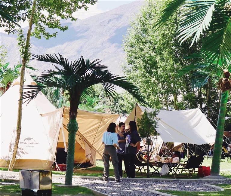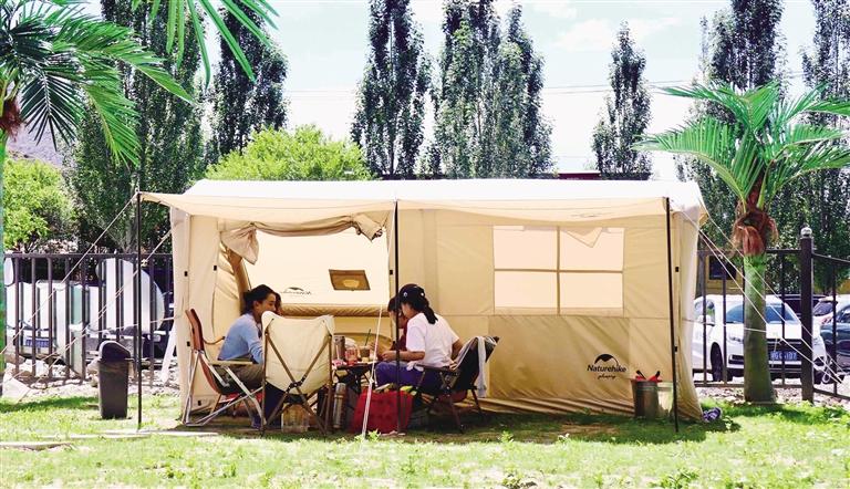 在拉薩,還未踏進(jìn)林卡營(yíng)地,便能聞到烤肉的香氣,尋著歡笑聲走去,你會(huì)發(fā)現(xiàn),這些林卡營(yíng)地宛如“桃花源”呈現(xiàn)在眼前。不論是藏式林卡營(yíng)地還是西式露營(yíng)地,都有共同的“魔力”——把“煩惱”擋在門外。一頂頂白色的帳篷和天上的朵朵白云相呼應(yīng),綠色的草地是夏天才有的限定“地毯”,抬頭,油綠而繁茂的樹葉在微風(fēng)中婆娑,似乎在回應(yīng)著樹下人群的歡笑。讓人不禁感嘆,原來,大自然才是治愈內(nèi)心最好的良藥。