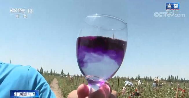 除了紅枸杞之外,這里還種植了15000多畝的有機(jī)黑枸杞,黑枸杞的成熟時間要遲一些,在8月下旬,所以我現(xiàn)在手里只有黑枸杞干。大家可以看一看,如果我們把它也像紅枸杞一樣泡入水中的話,顏色展開得非??欤瑤酌腌姷臅r間水就已經(jīng)是藍(lán)紫色了。當(dāng)?shù)氐呢?fù)責(zé)人告訴我,這很大程度是因?yàn)樗幕ㄇ嗨睾扛?,所以黑枸杞也有另外一個名字,叫作“花青素之王”。