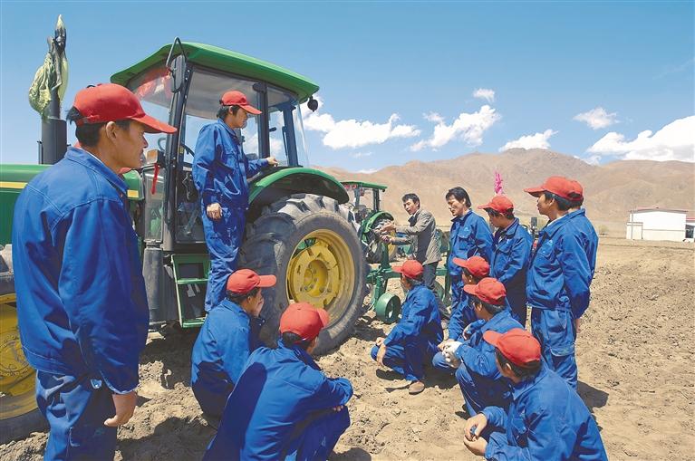 發(fā)展教育脫貧一批。2016年以來,累計(jì)落實(shí)義務(wù)教育學(xué)?;窘ㄔO(shè)資金84.4億元,實(shí)施教育基礎(chǔ)建設(shè)項(xiàng)目1433個(gè),資助建檔立卡和農(nóng)村低保大學(xué)生累計(jì)6.06萬人次,落實(shí)資助資金3.55億元。圖為西藏自治區(qū)白朗縣邀請山東農(nóng)機(jī)技師對當(dāng)?shù)刎毨糸_展培訓(xùn)。
