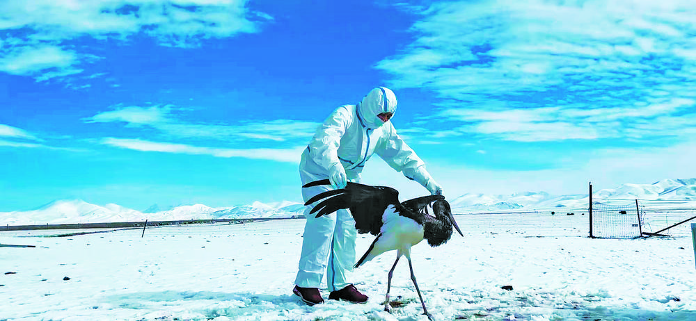 圖為尕布藏輔助受傷的黑鸛行走。