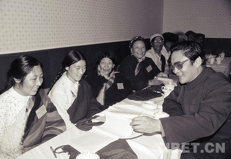 這是時(shí)任西藏自治區(qū)黨委副書(shū)記熱地(右)在與人大代表進(jìn)行交流。1988年1月15日至23日,西藏自治區(qū)第四屆人民代表大會(huì)第六次會(huì)議在拉薩召開(kāi)(唐召明1988年攝)