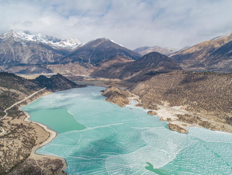 2月16日,西藏昌都,然烏湖半冰半水的湖面與雪山、藍(lán)天相互映襯,美如畫(huà)卷。(無(wú)人機(jī)照片)