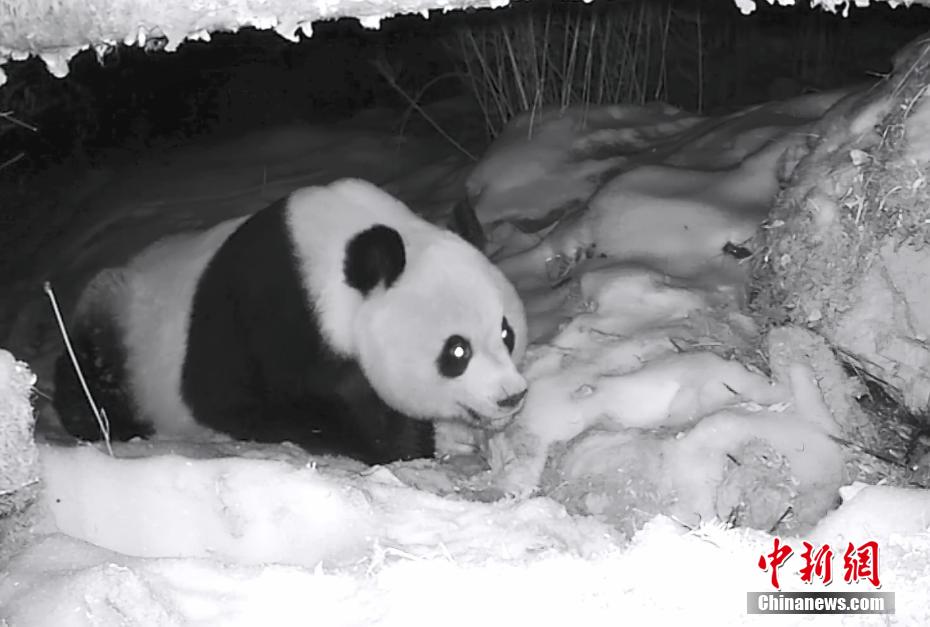 近日,大熊貓國家公園四川平武王朗片區(qū)工作人員在回收野外紅外線相機時,發(fā)現(xiàn)幾段野生大熊貓在雪地中找水喝的珍貴影像。圖為野生大熊貓在雪地中找水喝。
