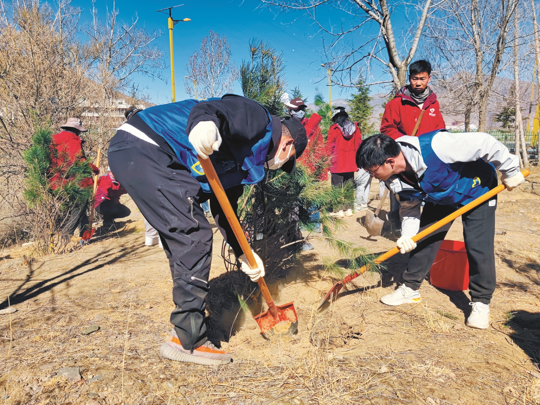 現(xiàn)場,志愿者手拿垃圾桶、夾子等工具,認真清理地面上的垃圾。隨后,不同團體志愿者被劃分為7個組開始植樹,大家干勁十足、配合默契,一起立苗、填土、澆水,有條不紊完成每道工序,并給每棵樹系上絲帶。經過一番熱火朝天的勞動,一棵棵新栽下的樹苗昂然挺立,為初春的山坡增添了一片新綠?;顒娱g隙,大家相互交流,憧憬著多年后荒灘變青山的場景。