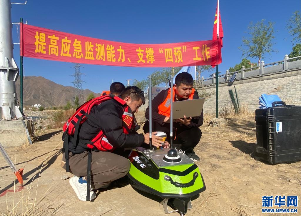應(yīng)急演練現(xiàn)場,參訓(xùn)技術(shù)人員正在調(diào)試水文監(jiān)測設(shè)備——無人船。(4月27日攝)新華社記者 春拉 攝
