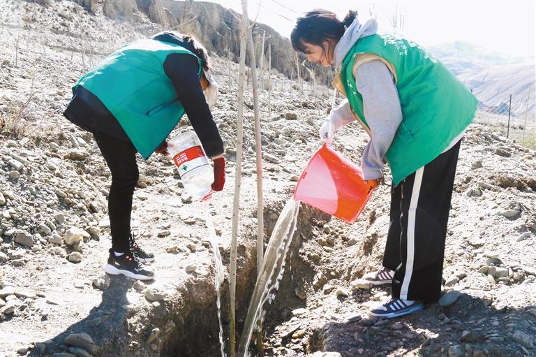 圖為志愿者在為樹苗澆水。記者 段敏 攝