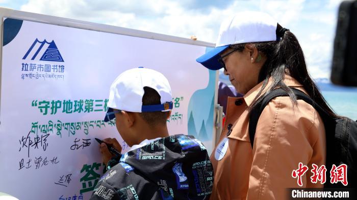 圖為青少年在公益環(huán)保簽名活動上簽名。拉薩市圖書館供圖