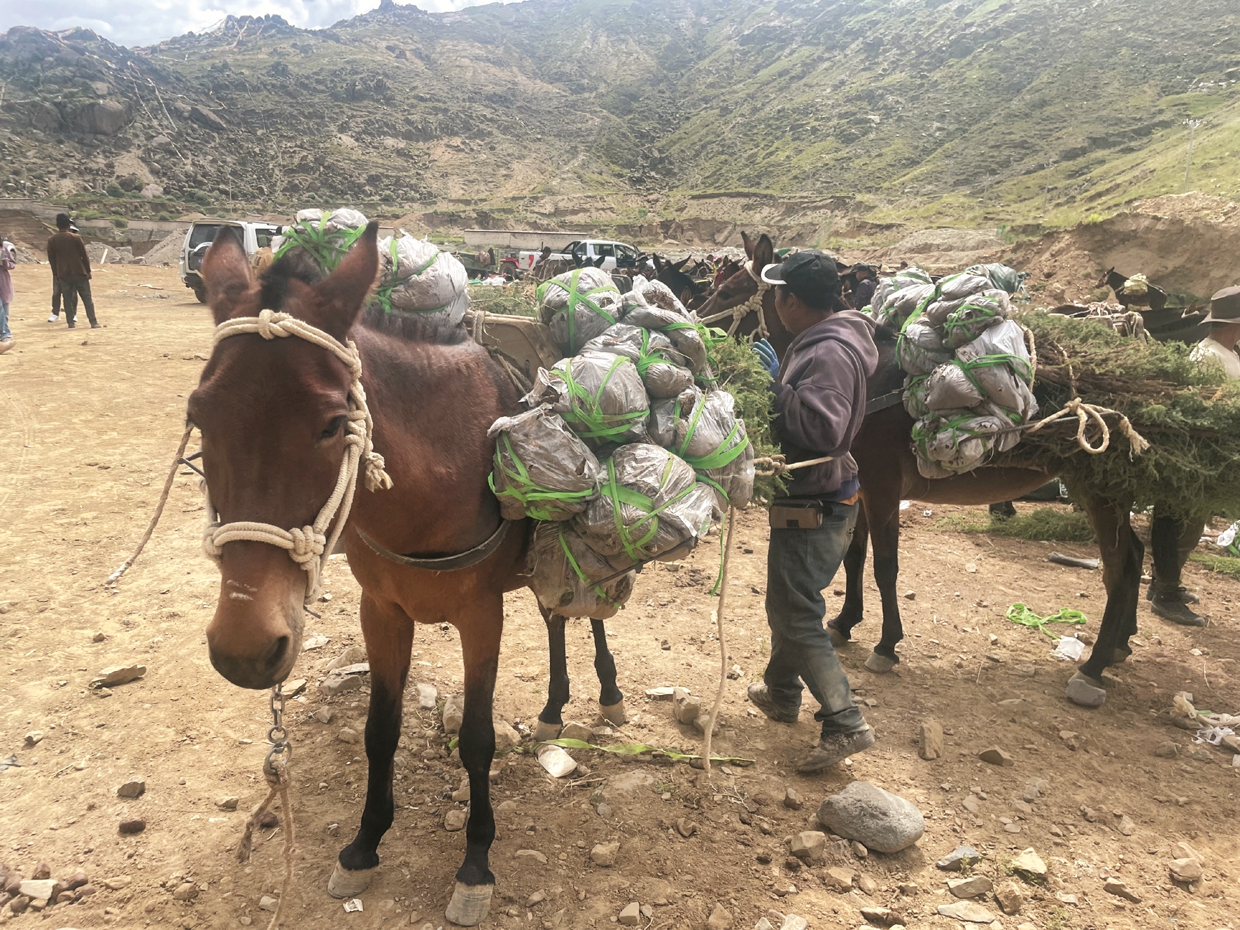 在堆龍德慶區(qū)乃瓊鎮(zhèn)色瑪造林片區(qū),植樹造林面積有4876.2畝,種植沙棘、祁連圓柏、油松等苗木共計(jì)58.79萬(wàn)株。該植樹造林點(diǎn)位于山頂,山路陡峭,為了將苗木運(yùn)送上山,施工單位雇傭了群眾騾馬隊(duì),每天保障100匹騾馬幫助運(yùn)送苗木。施工現(xiàn)場(chǎng),騾馬隊(duì)按規(guī)范將苗木進(jìn)行分裝,每匹騾馬分裝苗木10余株,運(yùn)送上山后由工人栽種。騾馬隊(duì)每天能運(yùn)送苗木5000株。