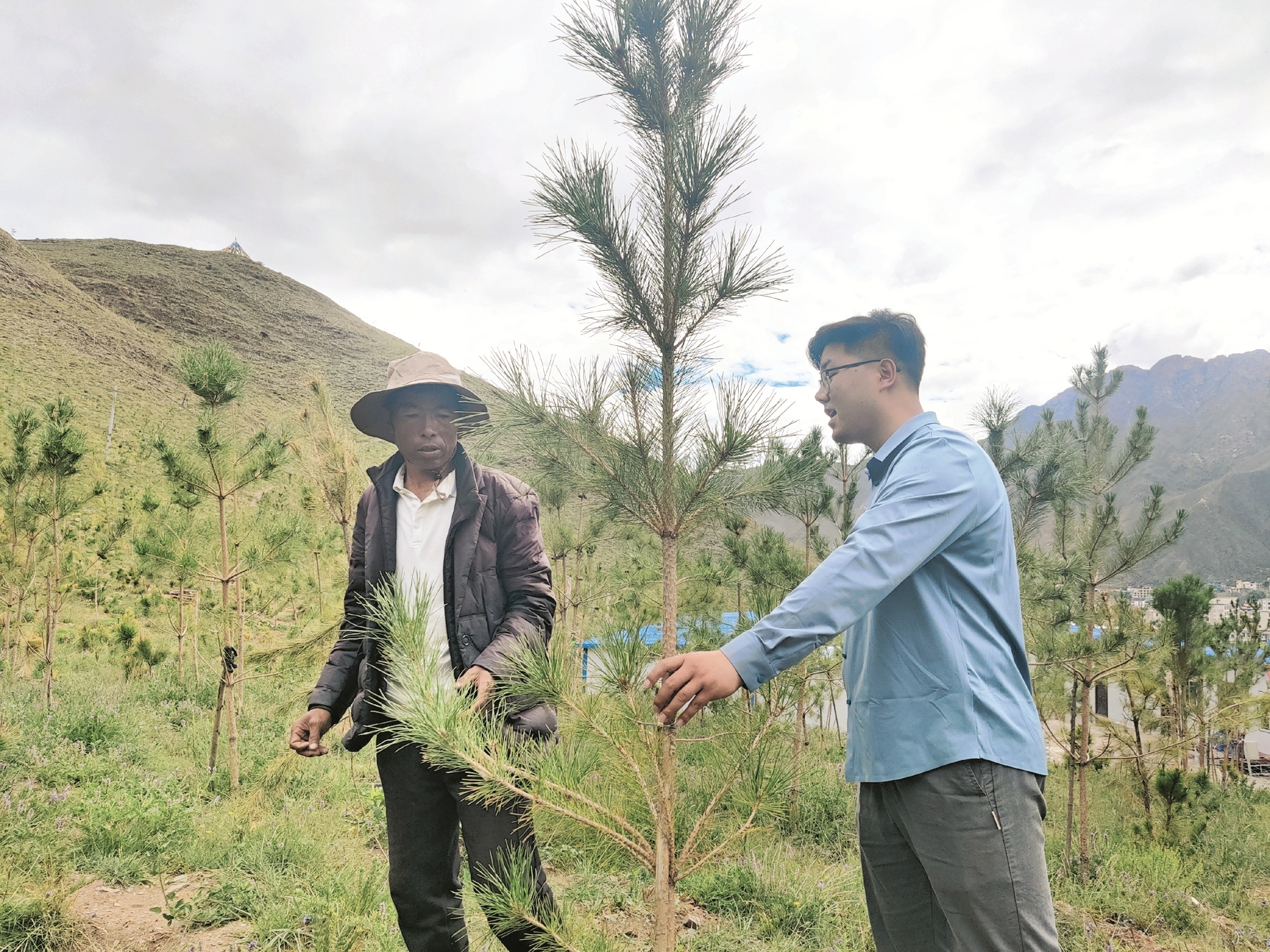 圖為在南北山綠化慈覺(jué)林1-1號(hào)片區(qū),工作人員正在查看苗木長(zhǎng)勢(shì)。拉薩融媒記者 余洋洋攝