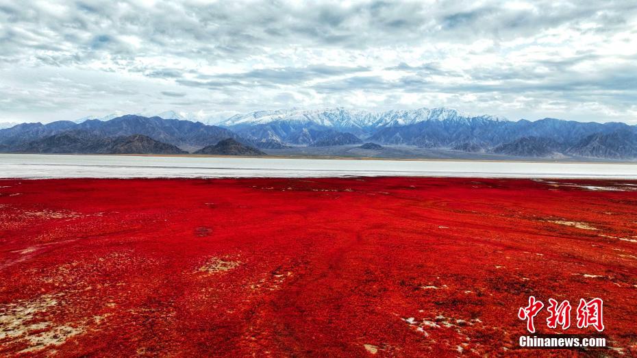 近日,在位于柴達(dá)木盆地的青海省海西蒙古族藏族自治州烏蘭縣都蘭湖國(guó)家濕地公園,岸邊的鹽生植物鹽爪爪將大地染成了紅色,黑頸鶴、斑頭雁、鵝喉羚等重點(diǎn)保護(hù)動(dòng)物在“大地紅毯”上嬉戲、覓食、休憩……攝影愛好者記錄下這美好、愜意的畫面,畫面中巨大的“紅地毯”與藍(lán)天、白云、雪山交相輝映,宛若宮崎駿筆下的童話世界。圖為鹽生植物鹽爪爪染紅了大地。