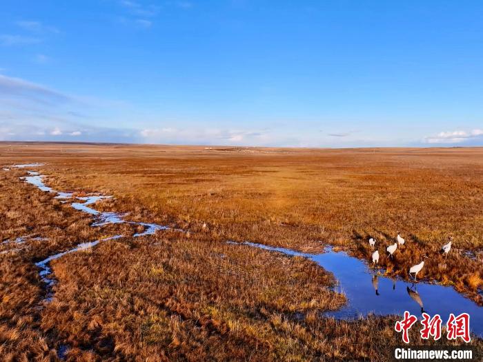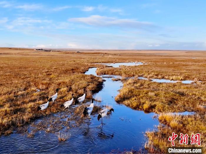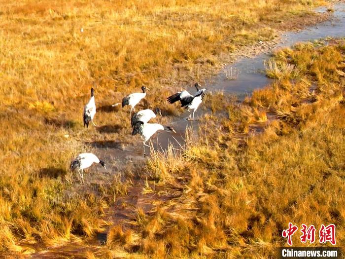 金秋十月,位于青海湖北岸的草原一片金黃。攝影愛好者在青海省海北藏族自治州剛察縣吉爾孟鄉(xiāng)日格加柔地區(qū),拍攝到六只黑頸鶴在這里“安家落戶”,它們或擠在一起沐浴秋日的暖陽,或三五成群覓食嬉戲、閑庭信步,為草原增添了一份靈動(dòng)與生機(jī)。黑頸鶴被稱為“高原仙子”“鳥類大熊貓”,是全球十五種鶴類中唯一在高原繁殖和棲息的鶴類。