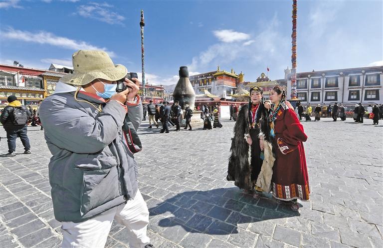 游客在大昭寺廣場拍照留念。記者 唐斌 攝