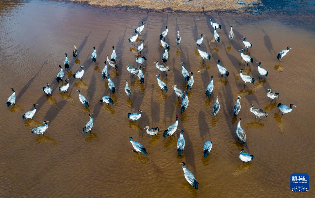 這是12月5日清晨在拉薩市林周縣虎頭山水庫(kù)拍攝的越冬黑頸鶴(無(wú)人機(jī)照片)。新華社記者 姜帆 攝