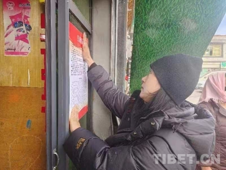 圖為郝如村駐村工作人員在街邊店鋪張貼宣傳海報