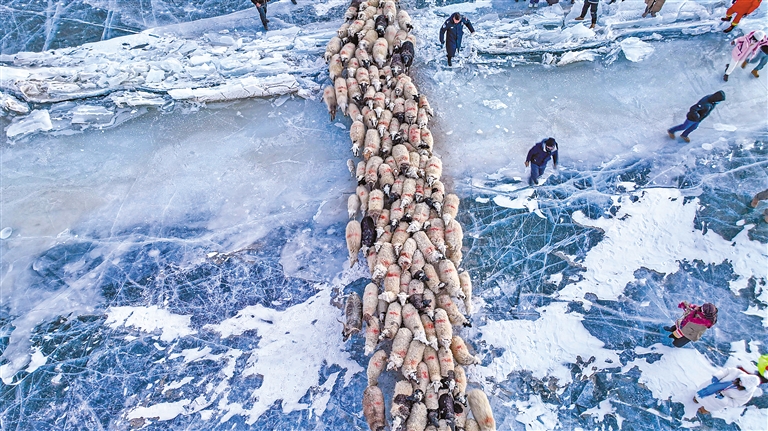 引路的牧羊人抱著羊羔走在前面,吸引著頭羊上冰。其他牧羊人驅(qū)趕著羊群跟在后面,幾只牧羊犬護(hù)衛(wèi)著羊群。