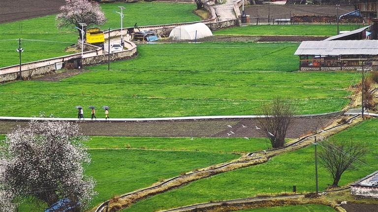 察隅縣古玉鄉(xiāng)羅馬村的桃花與綠野相映成趣。記者 謝筱純 王珊 攝