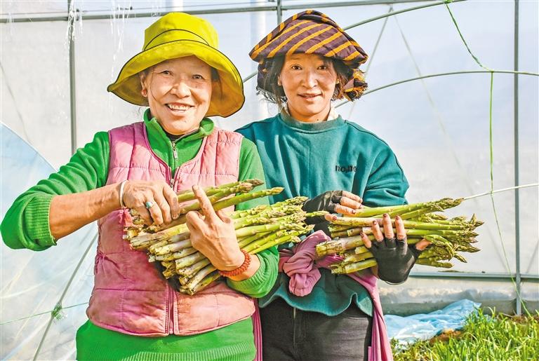 圖為大棚內(nèi),員工展示新鮮的有機(jī)蘆筍。記者 劉楓 攝