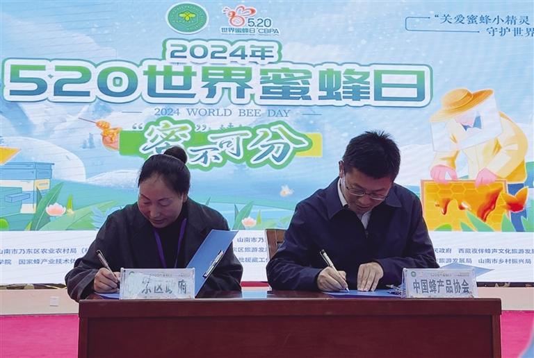 中國蜂產(chǎn)品協(xié)會(huì)領(lǐng)導(dǎo)與乃東區(qū)政府副區(qū)長宗巴(左)簽署共建“西藏山花蜂蜜之鄉(xiāng)”協(xié)議。記者 旦增玉珍 攝