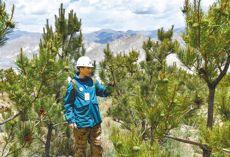工程的綠意還延伸至拉薩貢嘎機場周邊的山體,山南市林草局林業(yè)和草原有害生物防治站檢疫員次仁羅布在造林現場進行苗木復檢工作,復檢結果顯示這批苗木的成活率達到92%?!斑@里是走出貢嘎機場的第一站,旅客們可以直接看到我們種下的綠色,很有意義。”次仁羅布說。