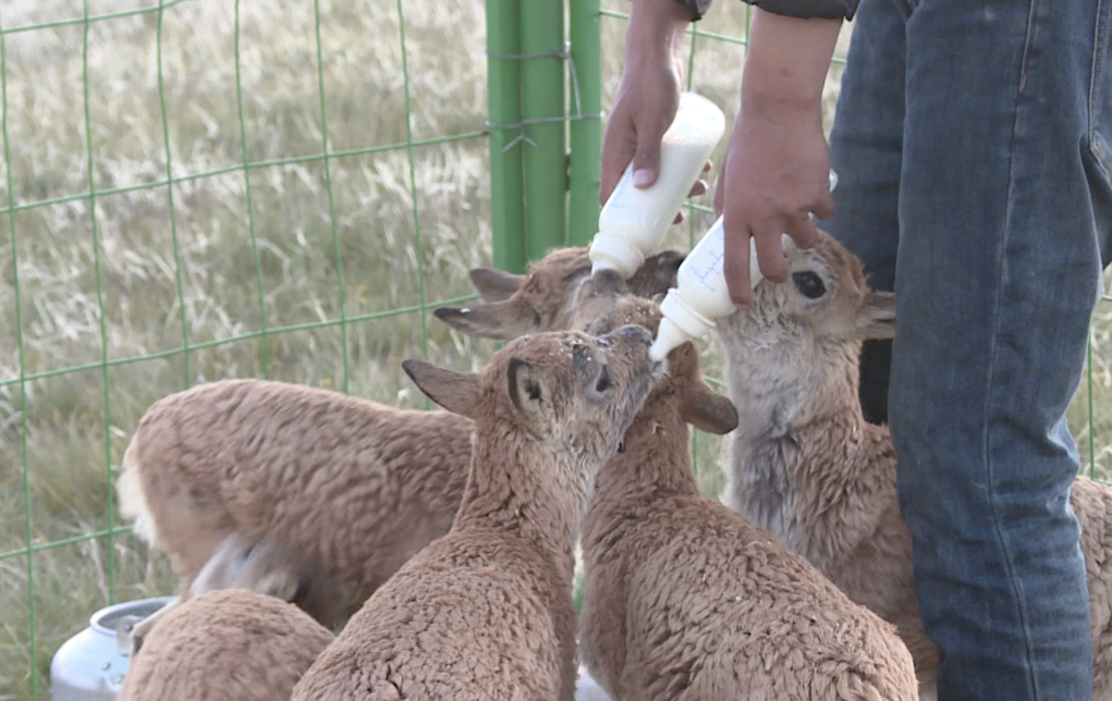 8月12日,在索南達(dá)杰保護(hù)站,保護(hù)站工作人員在給小藏羚羊喂奶。(杜笑微 攝)