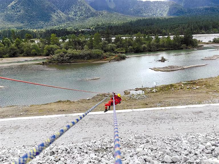 圖為波密縣森林消防中隊(duì)隊(duì)員開(kāi)展橫渡孤島轉(zhuǎn)移救援演練。記者 張宇 攝