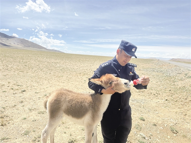 記者從阿里地區(qū)公安處了解到,日前,札達(dá)縣公安局吾藏檢查站民警巡邏時(shí)發(fā)現(xiàn)一只小野驢倒在馬路邊,民警將小野驢帶到檢查站并前往香孜鄉(xiāng)購(gòu)買奶瓶、純牛奶等物資救助小野驢。