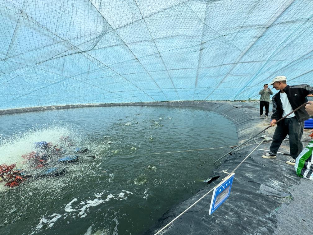 養(yǎng)殖基地的職工正在進(jìn)行捕撈。新華社記者沈曉朦 攝