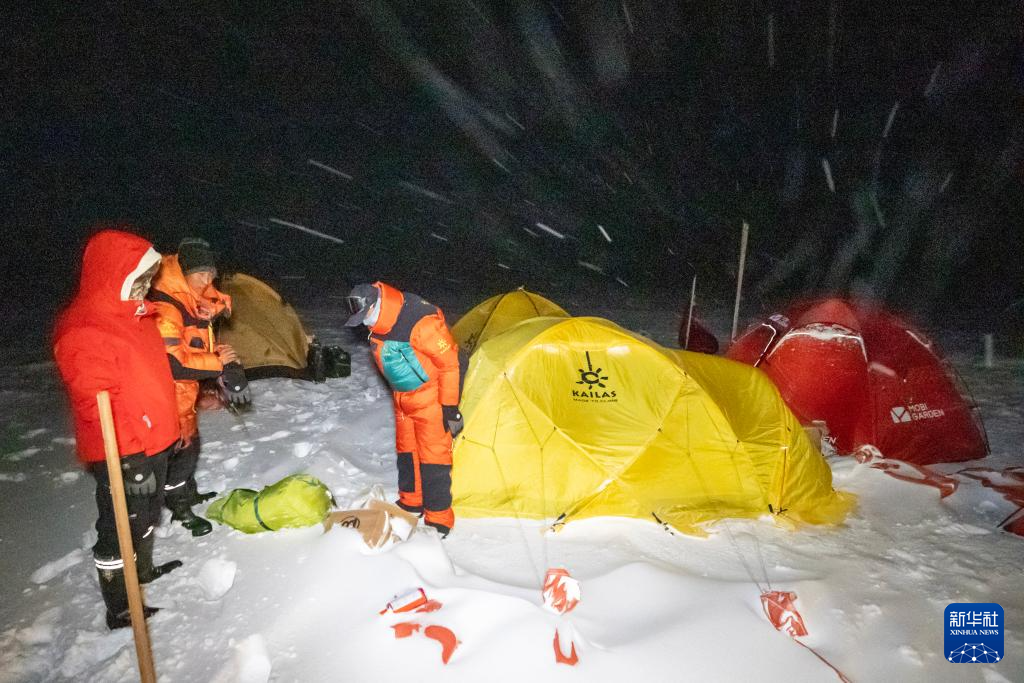 科考隊(duì)員在夜間的大風(fēng)雪中加固營(yíng)地(9月11日攝)。新華社記者 姜帆 攝