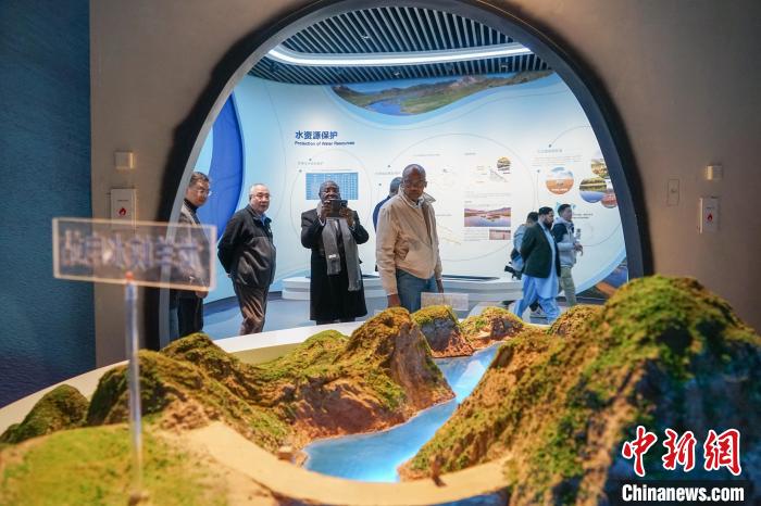 圖為代表團(tuán)成員在青海省自然資源博物館內(nèi)通過模型了解青海省水資源。中新社記者 馬銘言 攝