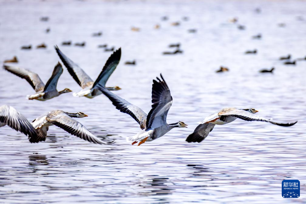 斑頭雁在班公湖水面上飛翔(11月16日攝)。新華社記者 姜帆 攝