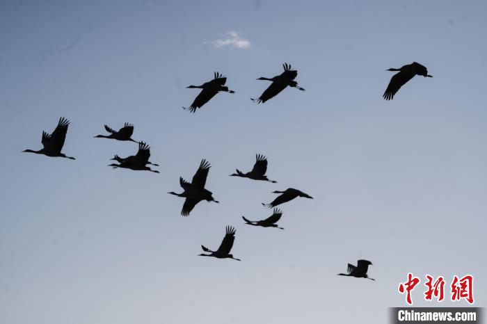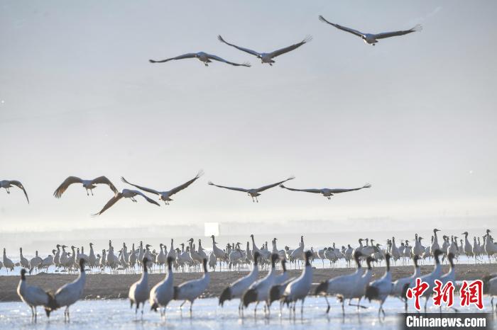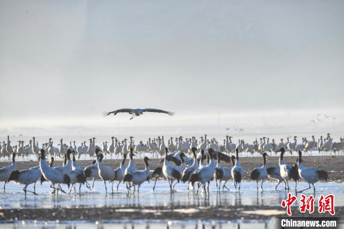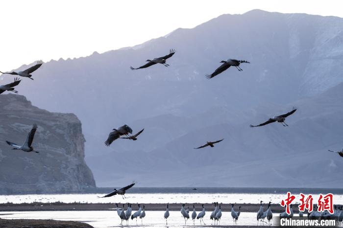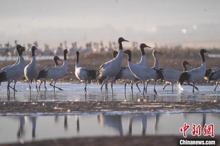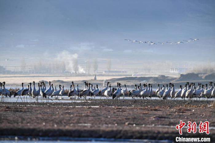 11月27日晨,西藏自治區(qū)拉薩市林周縣黑頸鶴保護(hù)區(qū)內(nèi),大量越冬的黑頸鶴在虎頭山水庫覓食、嬉戲。林周縣位于拉薩河上游及澎波河流域,平均海拔約4200米,是黑頸鶴的主要越冬地之一。中新社記者 貢嘎來松 攝