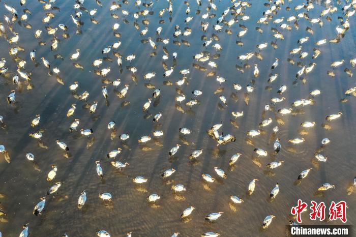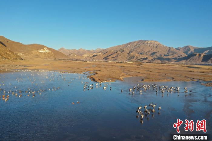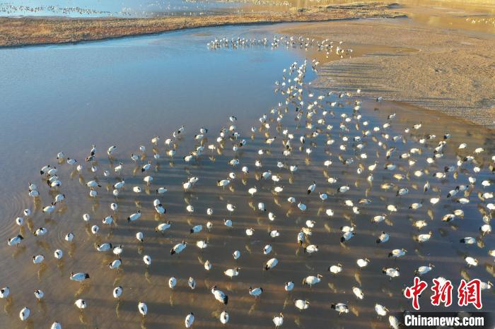 11月27日晨,西藏自治區(qū)拉薩市林周縣黑頸鶴保護(hù)區(qū)內(nèi),大量越冬的黑頸鶴在虎頭山水庫覓食、嬉戲。林周縣位于拉薩河上游及澎波河流域,平均海拔約4200米,是黑頸鶴的主要越冬地之一。(無人機(jī)照片)中新社記者 貢嘎來松 攝