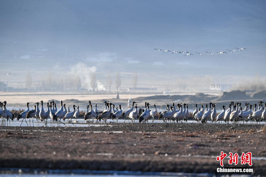 11月27日晨,西藏自治區(qū)拉薩市林周縣黑頸鶴保護區(qū)內(nèi),大量越冬的黑頸鶴在虎頭山水庫覓食、嬉戲。林周縣位于拉薩河上游及澎波河流域,平均海拔約4200米,是黑頸鶴的主要越冬地之一。