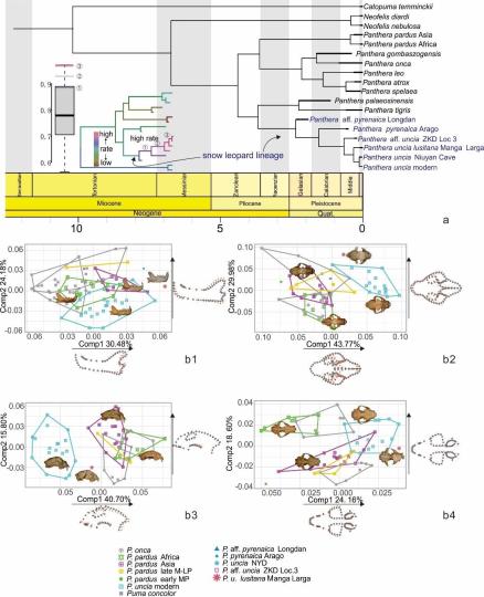 由于青藏高原地區(qū)化石相對(duì)稀疏,第四紀(jì)(約260萬前至今)以來的記錄尤為稀少,雪豹是如何逐步演化出如今特化適應(yīng)青藏高原的模樣仍然不明。分子生物學(xué)的研究支持雪豹現(xiàn)生親緣關(guān)系最近的物種是虎,但雪豹和虎的形態(tài)及生態(tài)適應(yīng)都截然不同,僅僅依靠分子生物學(xué)解決不了雪豹是如何特化的問題。