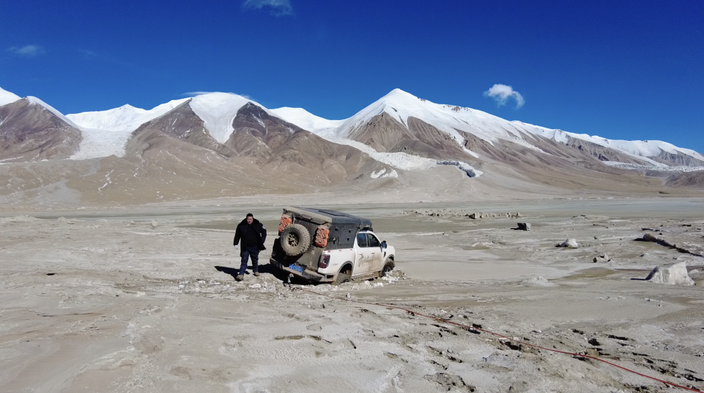 巡山隊員駕駛的車輛在布喀達(dá)坂峰山腳下陷入雪地中等待施救(攝于2025年1月14日)。新華社記者 杜笑微 攝